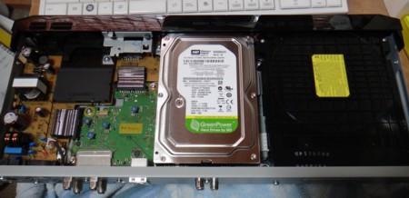 右側にBDドライブ、中央にHDD、左側に電源、メイン基板が見えます。